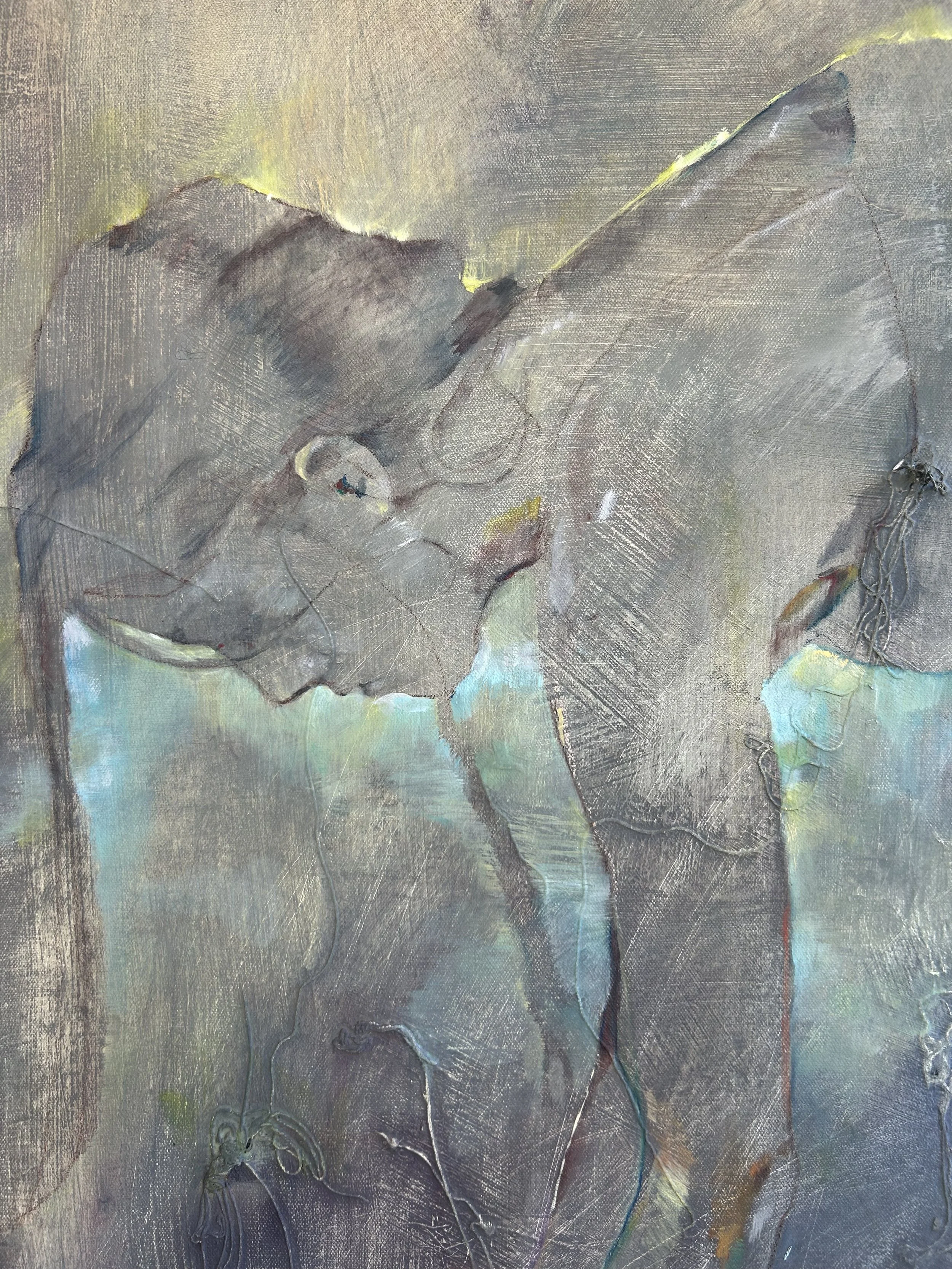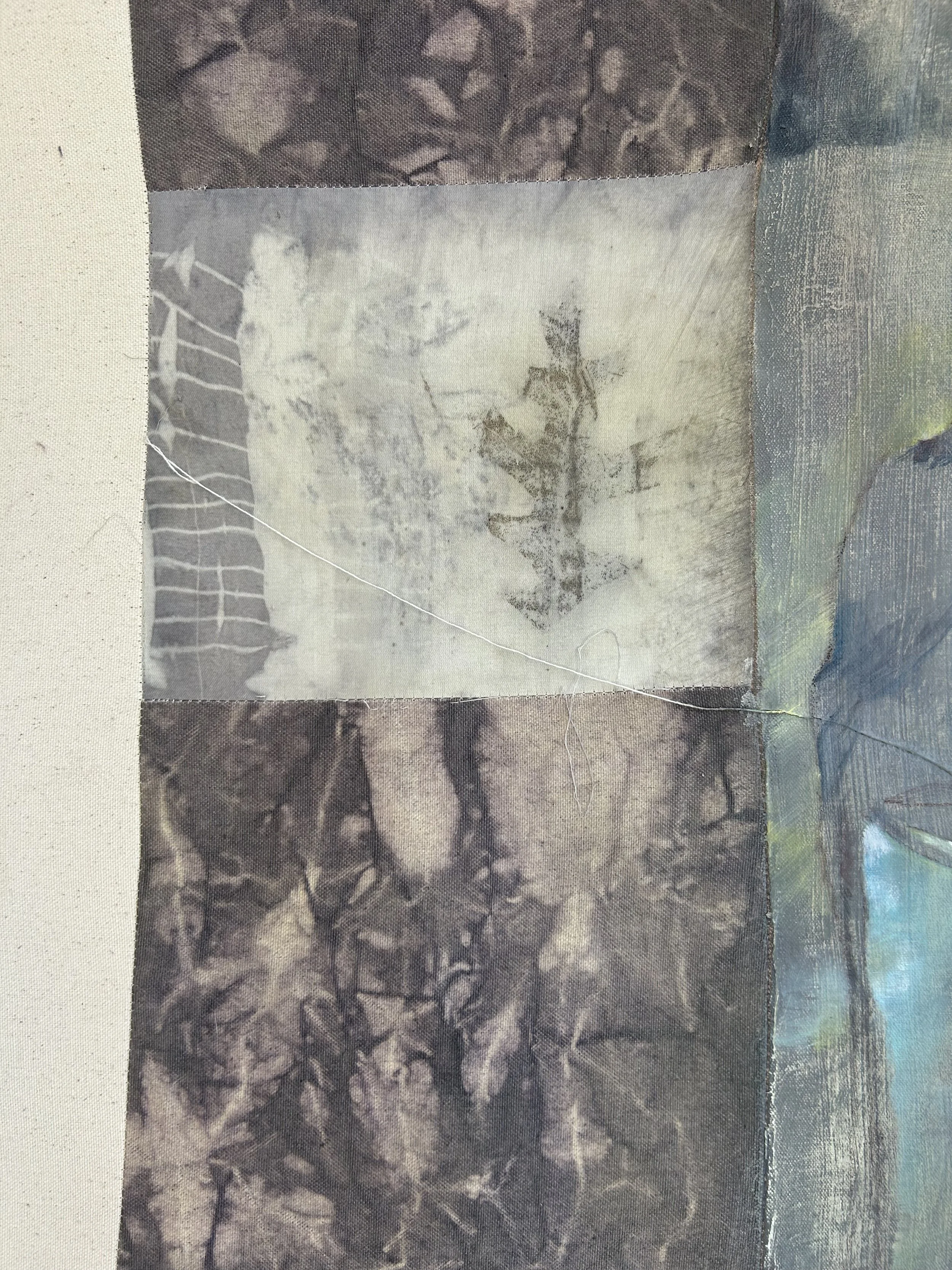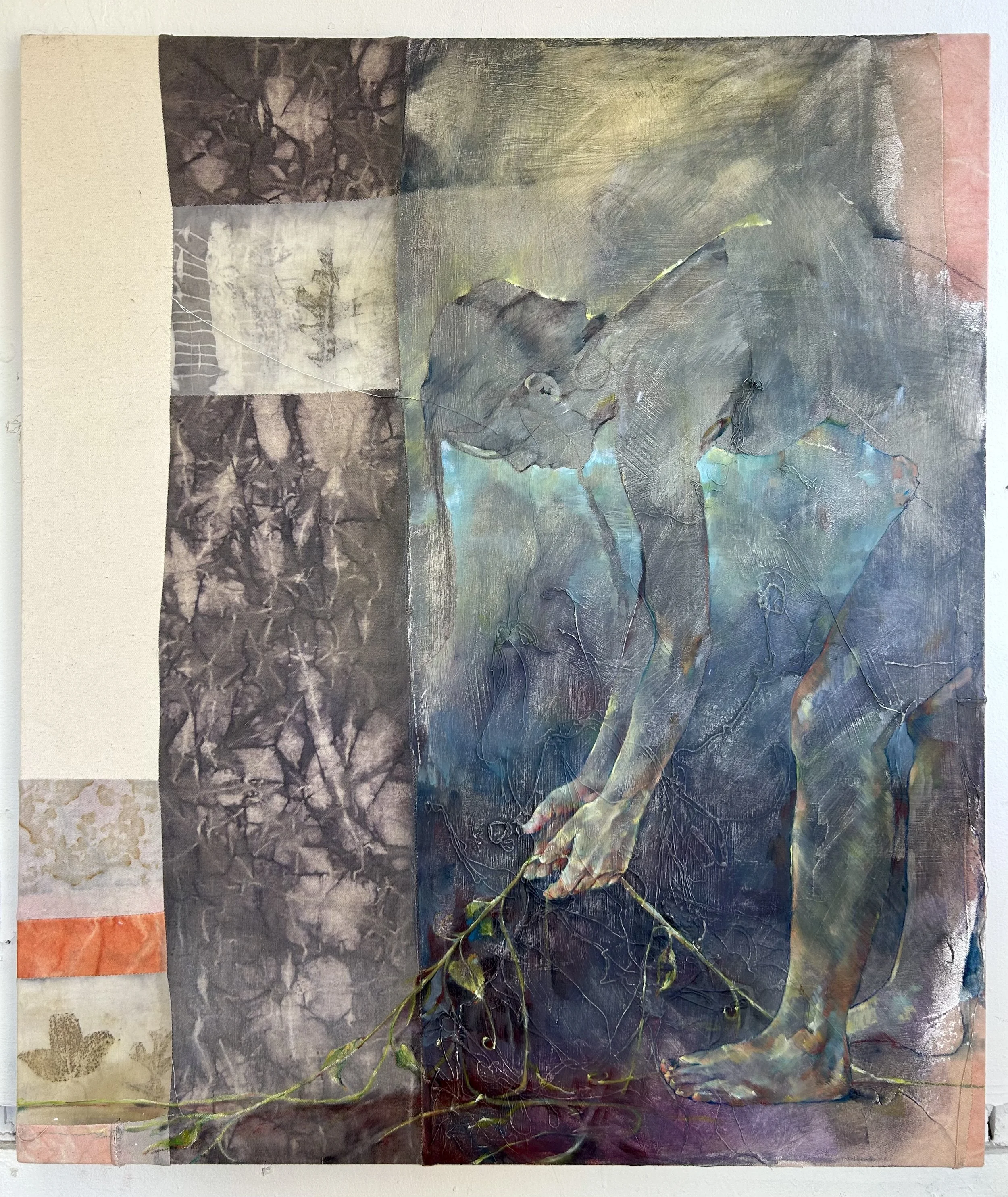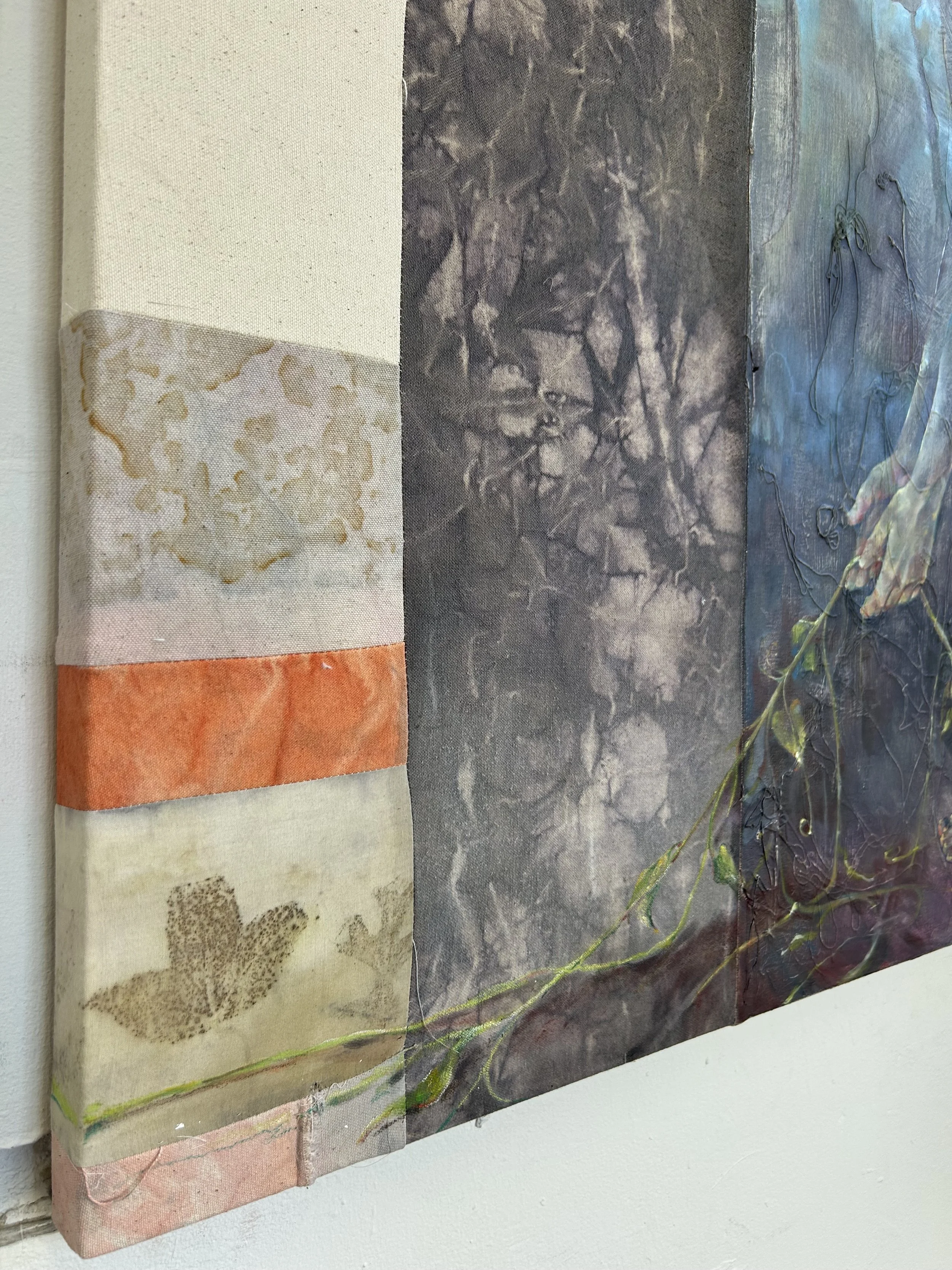 Down the Vine, Natural dyes(madder, logwood, leaf ecoprints), discarded canvas threads, tissue paper, tempera paint, oil paint and chalk, on sewn together canvas and cotton, 42”x36”, 2025
