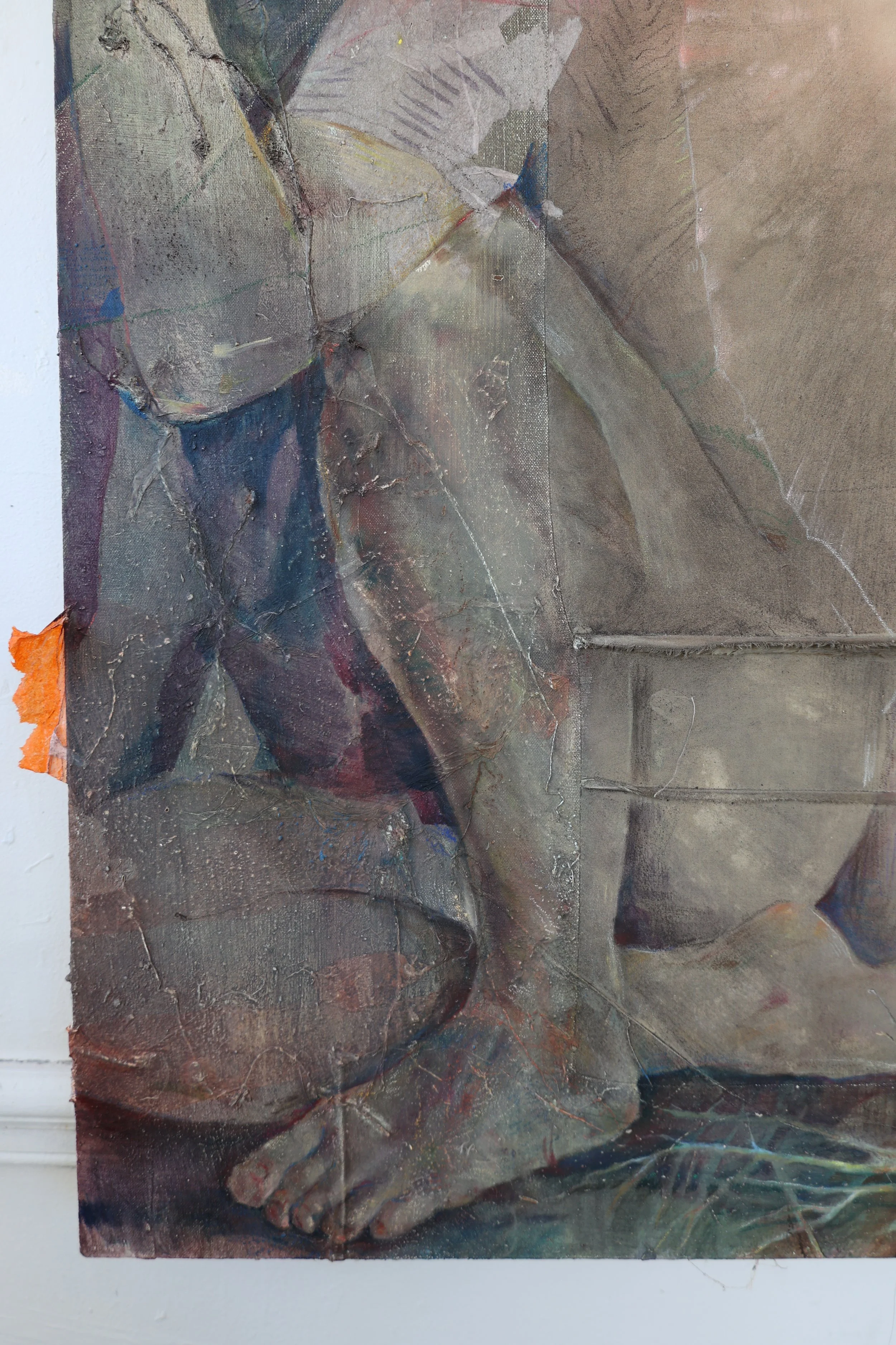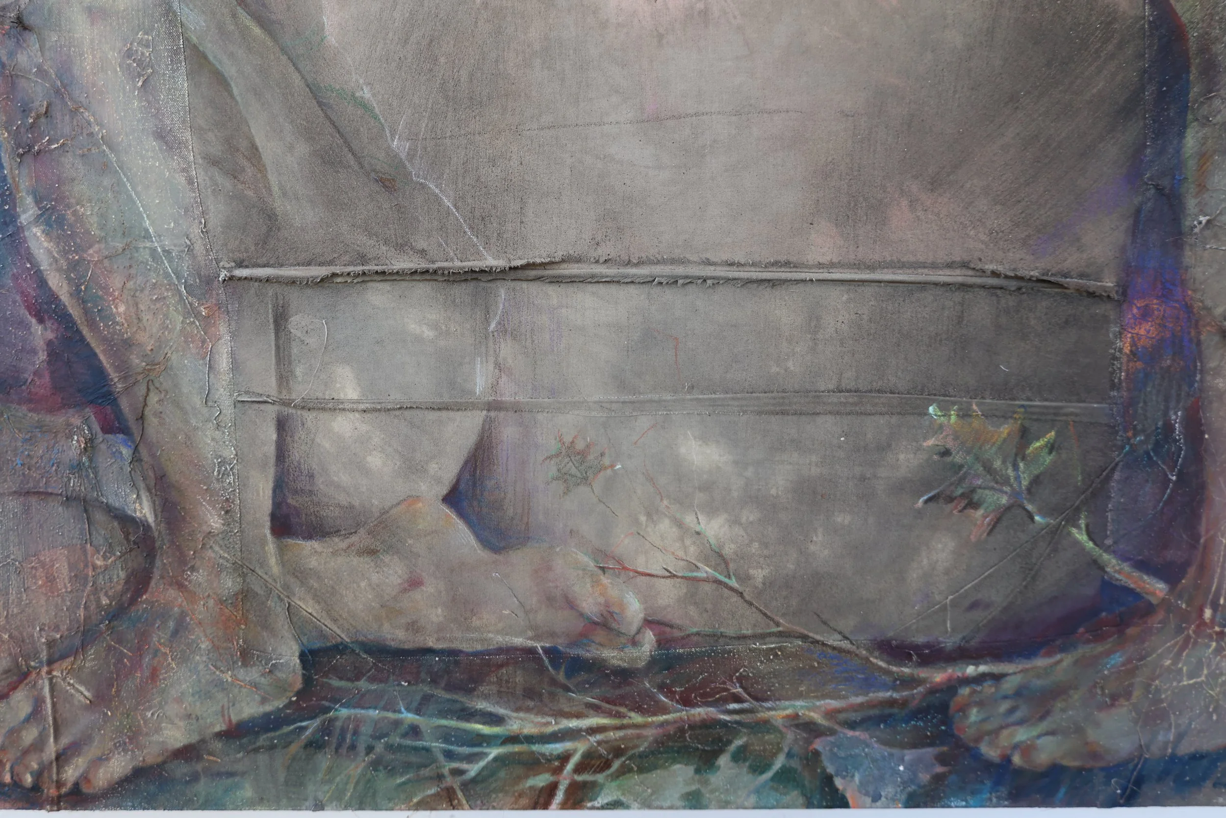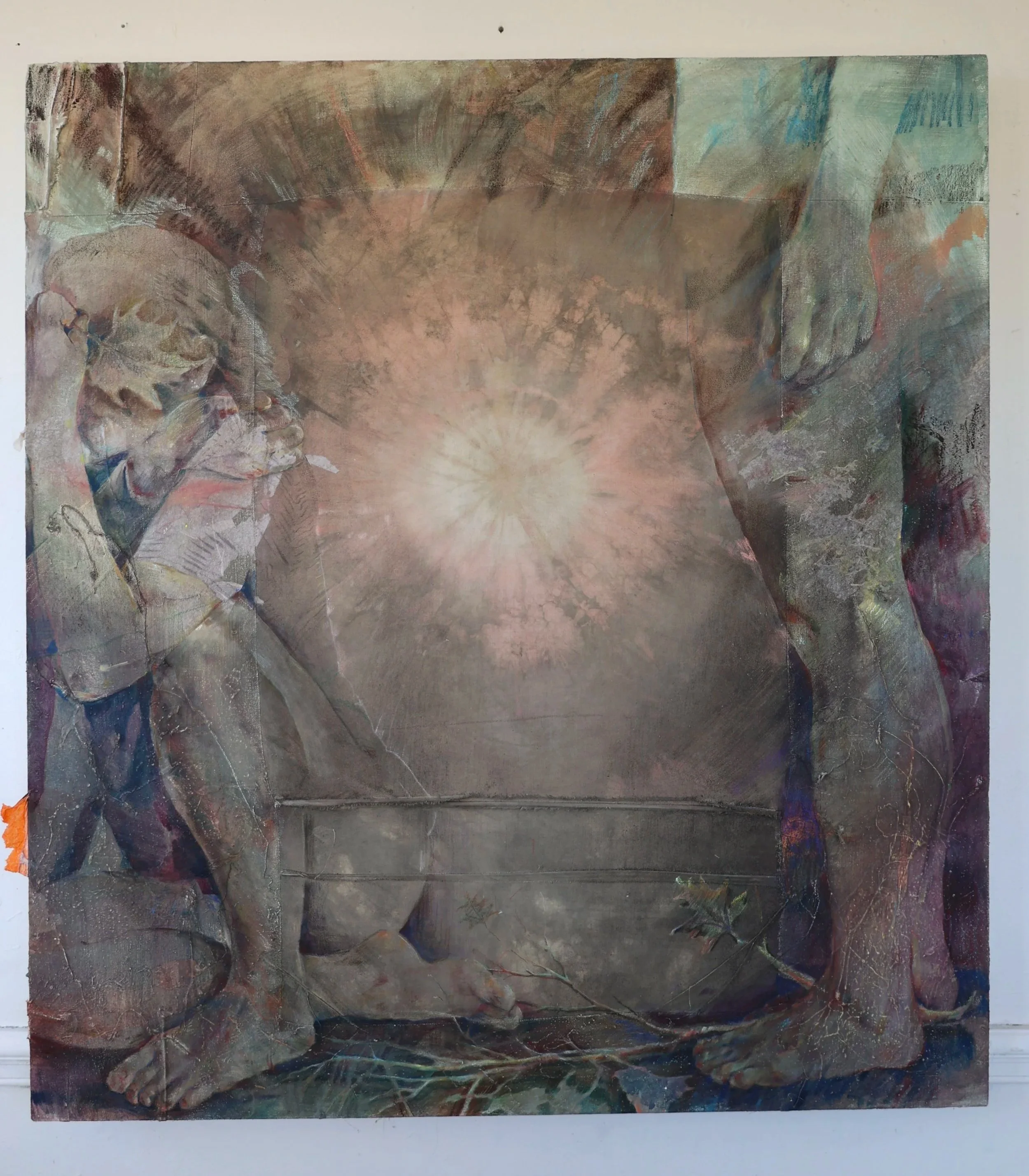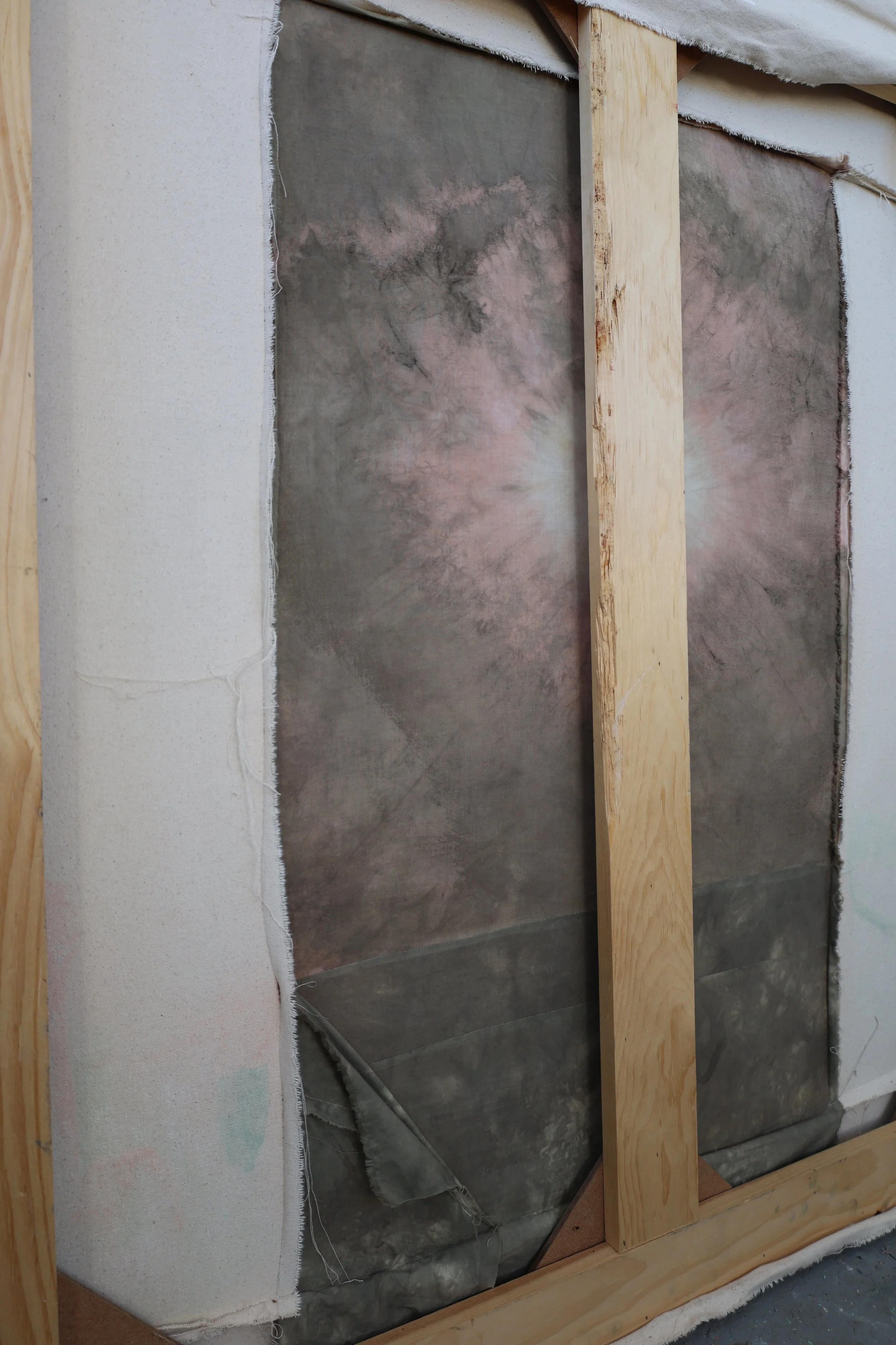 Under the Sycamore, Paper and discarded canvas threads, dirt, pastels and oil paint on naturally dyed and sewn cotton and canvas, 48”x46”, 2025